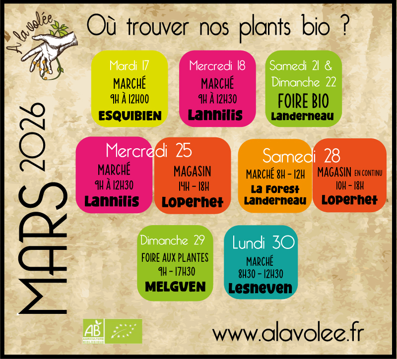 Nous lançons la saison printannière avec la traditionnelle Foire Bio de Landerneau les 21 et 22 mars.